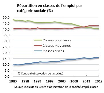 Si l’on y ajoute une fraction des ouvriers, des employés ainsi que des cadres supérieurs, leurs estimations aboutissent à une progression des classes moyennes de 40 % à 43 % de l’ensemble des emplois en trente ans. Et depuis 2012, leur proportion a même dépassé celle des catégories populaires.